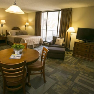 The Iron Blosam Lodge offers 16 different floor plans with units that range from studios that sleep 2 to loft suites that sleep 8. Some rooms have the ability to add adjoining rooms. Kitchens and fireplaces are available in most units.