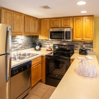*1 Bedroom Condos normally include one private bedroom, separate living area, kitchen with appliances, dining area, and a pull out sofa. Room layouts can differ between resorts.